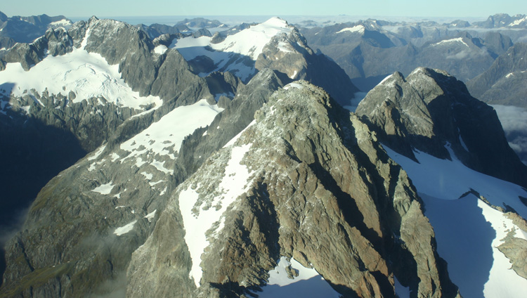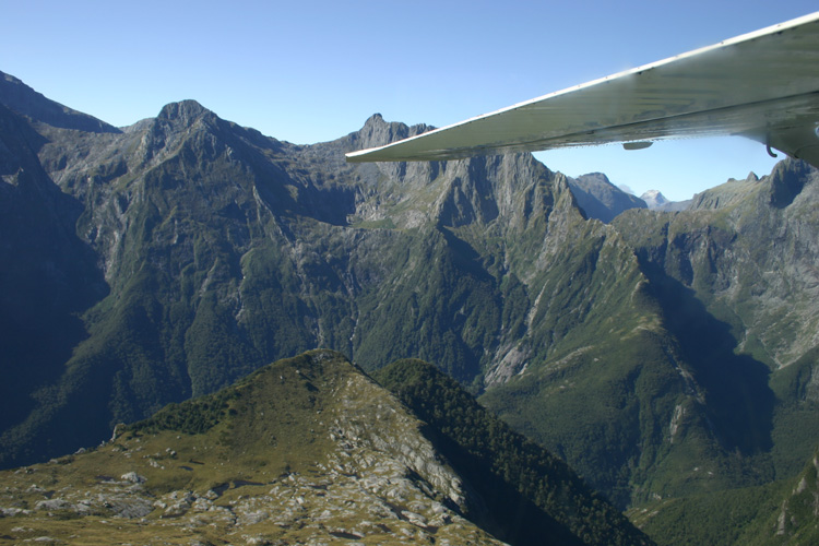 At the head of Lake Wakatipu lie a series of spectacular mountain ranges that form the southwest coast of the South Island. The Darren, Humbolt, Thomson, and Livingstone Mountains dominate the Southern Alps and the northern reaches of Fiordland National Park. World famous hiking tracks - the Routeburn, Milford, and Hollyford among others - traverse the mountains providing access to spectacular vistas. And jumping into a Cessna provides access to unique unsurpassed views too. (Click on the pictures to enlarge.)