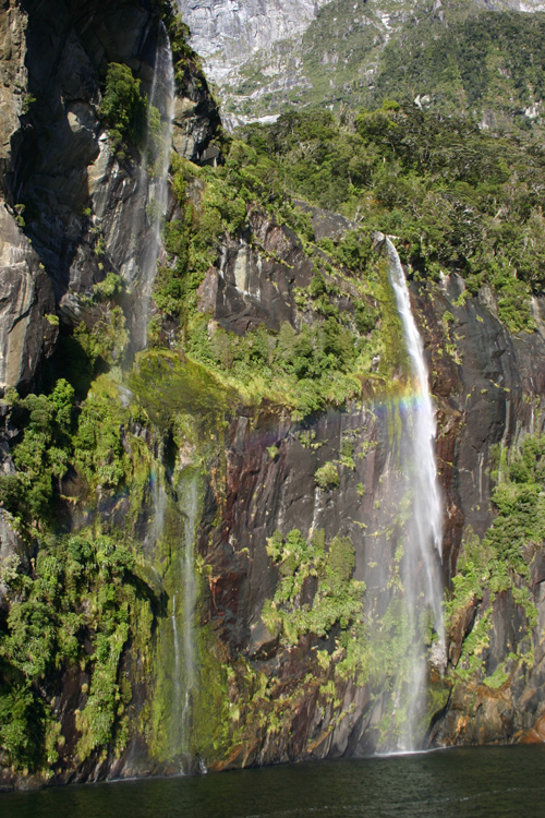 Along with the striking beauty of mountains shooting straight out of the sea, Milford Sound is also known for its impressive waterfalls. Among the many falls in the Sound are the Bridal Veil, Stirling, and Bowen Falls which release torrents of water straight into the sea off vertical rock walls. (Click on the pictures to enlarge.)